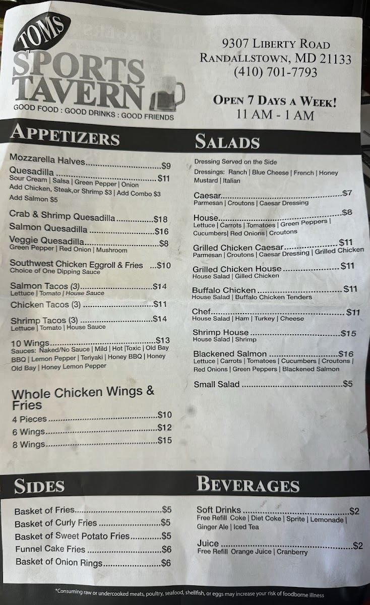 Tom’s Sports Tavern, nestled at 9307 Liberty Rd in Randallstown, MD, stands out as a welcoming haven for sports enthusiasts and food lovers alike. This cozy yet surprisingly spacious spot combines a vibrant atmosphere with genuinely flavorful dishes and attentive service. Whether you’re stopping by for a casual bite or settling in to catch a game, Tom’s offers a balance of great food, well-crafted drinks, and a friendly vibe that keeps patrons coming back.